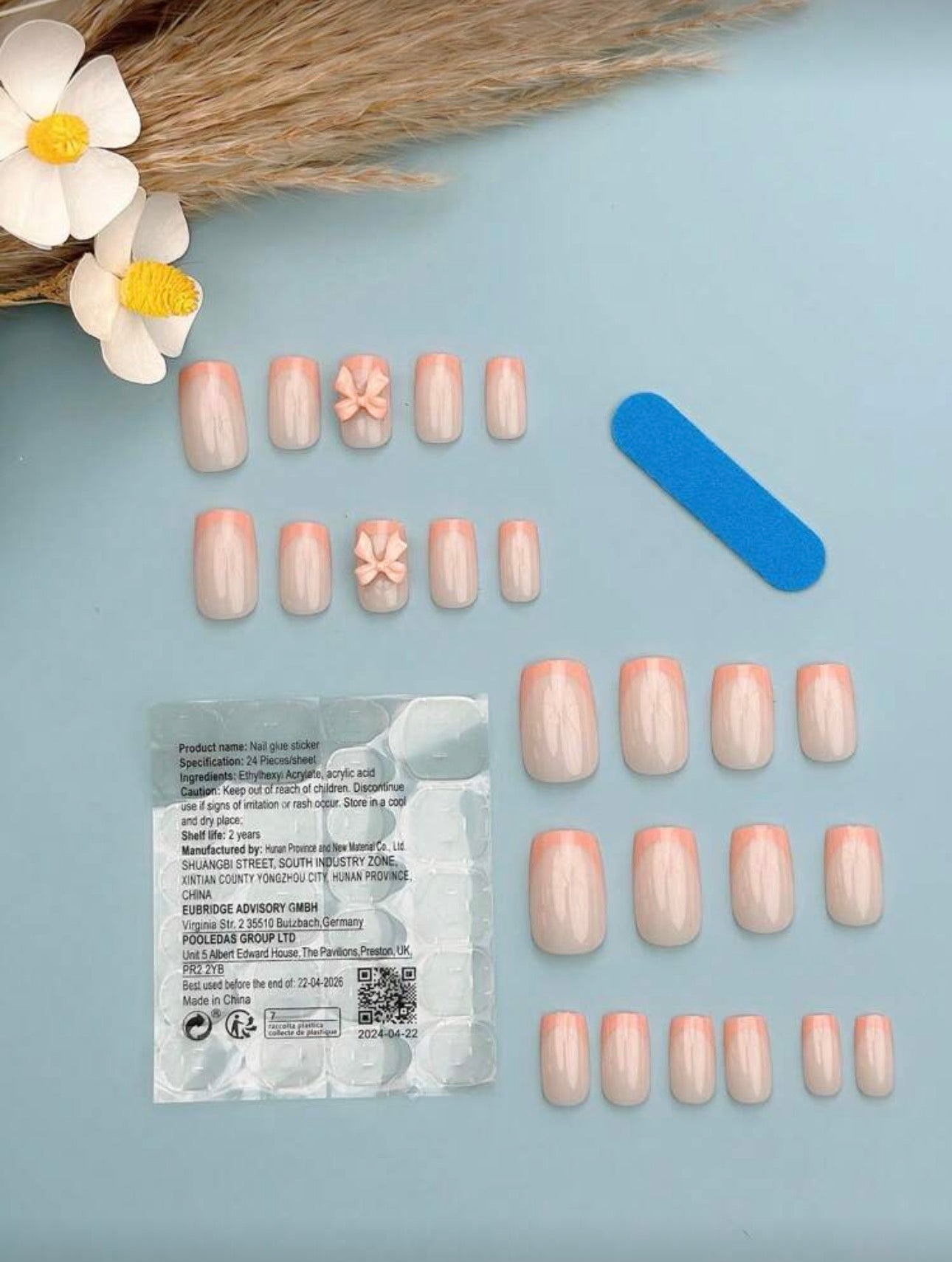 Upgrade your look instantly with these 24pcs Square Short Press On Nails, featuring a classic French nail design enhanced with stylish 3D burnt orange bows for a chic, modern twist.
