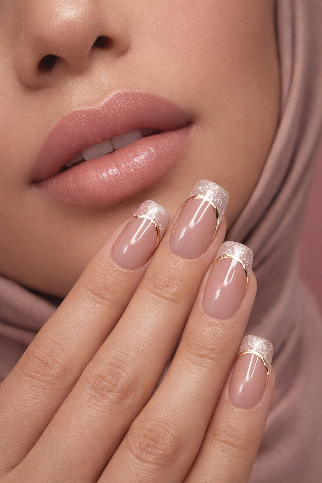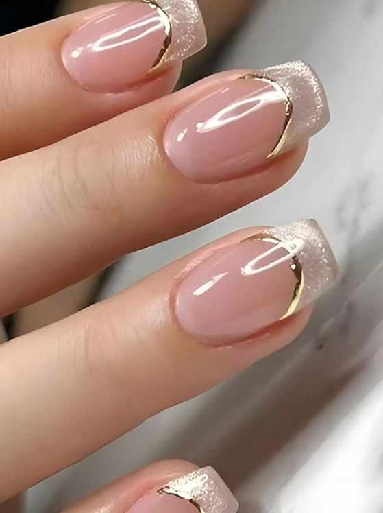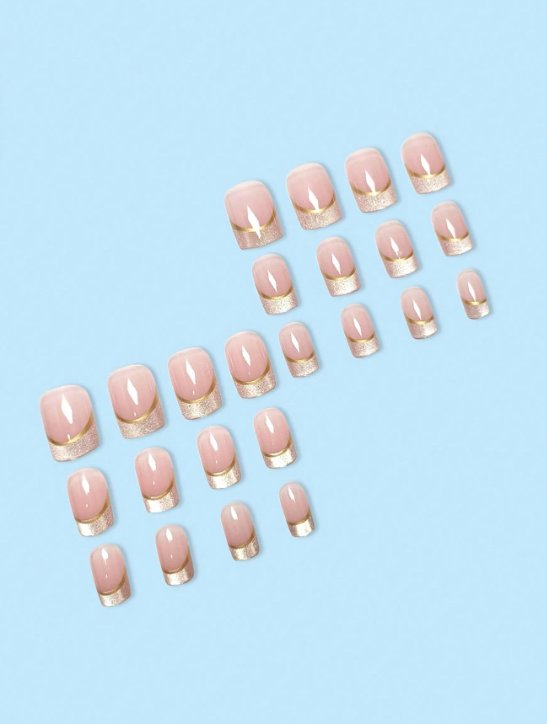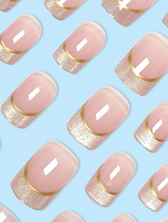 24-piece short square press-on nails with nude base, shiny tips, and elegant gold lines. Salon-quality press-on nails that are easy to apply with strong hold and long-lasting shine. Set includes nail glue and nail file. Perfect for daily office wear and date nights. 💅✨