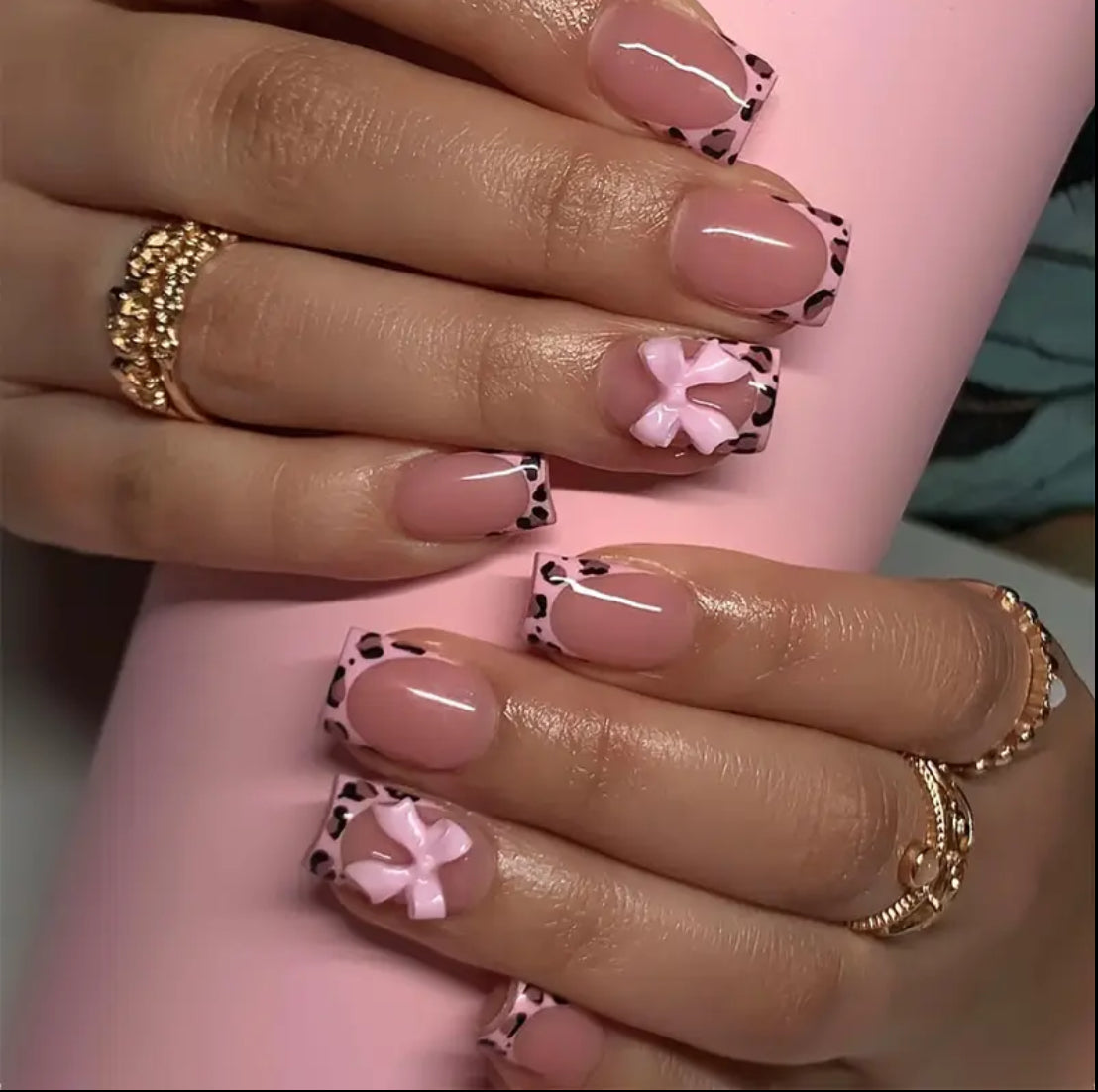Make a bold statement with this 24pcs Short Glossy Press On Nails Set, featuring a trendy pink leopard print with color-blocking bows. Inspired by European and American fashion trends, these detachable fake nails are perfect for women and girls who want stylish, eye-catching nails in minutes.