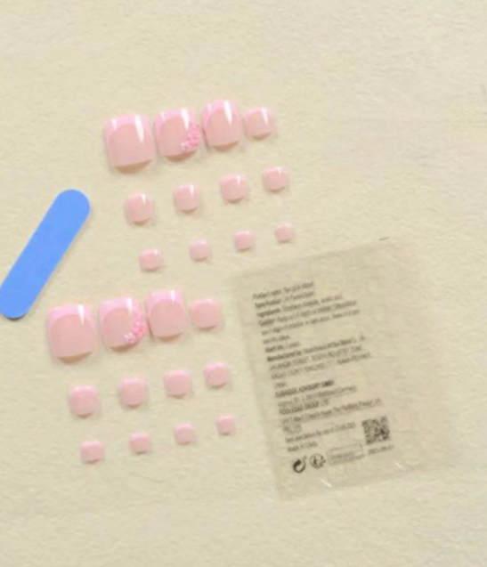 24pcs Pink & White French Toes Press-On Nails with 3D Silver Beads