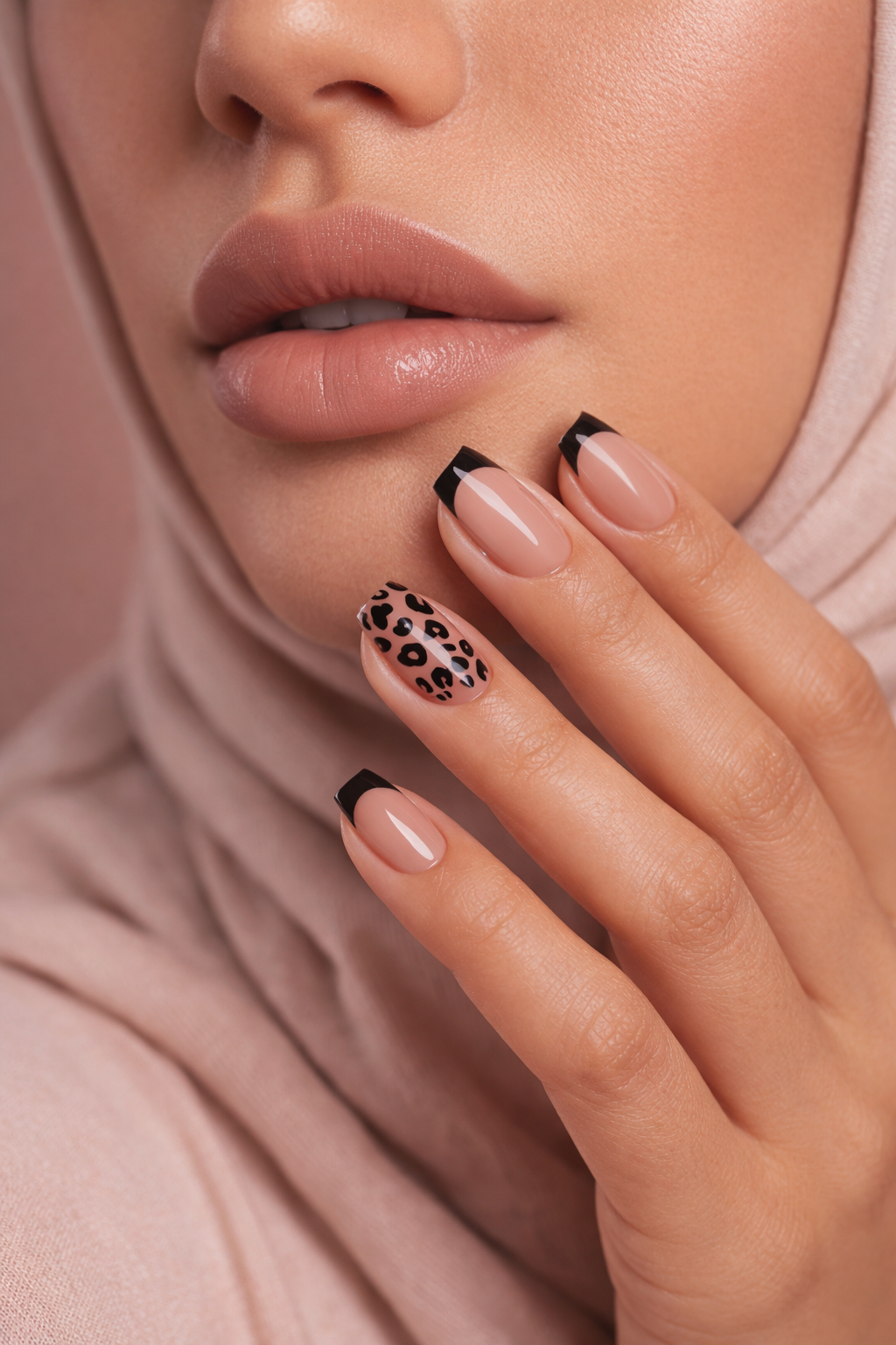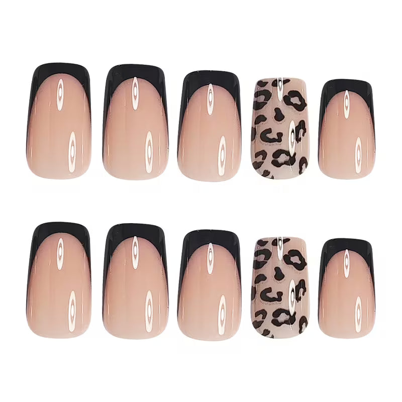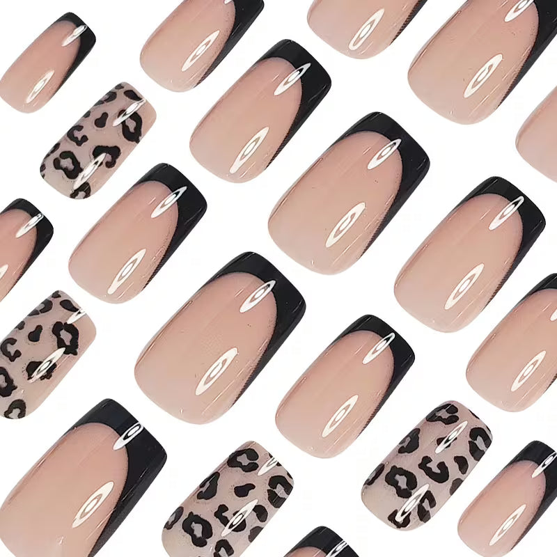 24pcs set of cute and elegant nude-colored press-on nails with classic black lines and black leopard print. Perfect for women, daily wear, and dates. Easy to apply with strong hold and long-lasting shine. Set includes jelly glue and a nail file. 💅🐆✨